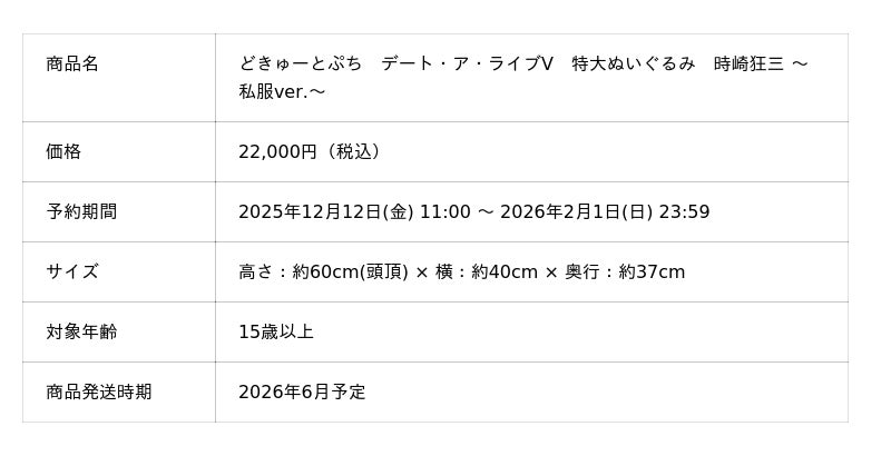 株式会社タイトー(本社:東京都新宿区、以下タイトー)は、特大ぬいぐるみブランド「どきゅーとぷち」の新商品として、『どきゅーとぷち デート・ア・ライブV 特大ぬいぐるみ』の予約販売を決定しました。ECサイト「TAITO GEAR&GOODS」(URL:https://taito-goods.jp/shop/default.aspx)にて、2025年12月12日(金) 11:00より「夜刀神十香」「時崎狂三」の予約受付を開始します。
