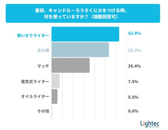次に、普段キャンドル・ろうそくに火をつける際、どのような道具を使用しているか尋ねました。ここでは「使いきりライター(62.8%)」が最も多く利用されていることが判明しました。