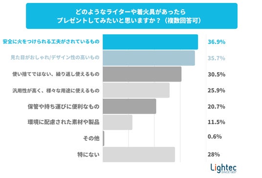 次に、どのようなライターや着火具であれば、プレゼントとして贈ってみたいと思うか尋ねてみました。ここでは、「安全に火をつけられる工夫がされているもの(36.9%)」が最も高く、次いで「見た目がおしゃれ/デザイン性の高いもの(35.7%)」、「使い捨てではない、繰り返し使えるもの(充電式、詰め替え式など)(30.5%)」が上位にランクインしました。消費者が着火具に対し、従来の機能性だけでなく、安全性、デザイン性、そしてサステナビリティといった付加価値も重視していることが明らかになっています。