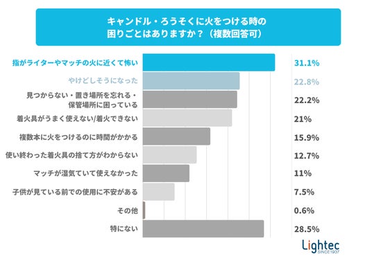 続いてのキャンドル・ろうそくに火をつける時の「困りごと」や「気になること」において、回答者の約3人に1人(31.1%)が「指がライターやマッチの火に近くて怖い」、が「やけどしそうになった(22.8%)」と回答しました。これらの経験は、短い炎の使いきりライターをキャンドル点火に使用する際に生じやすいリスクを示しており、より安全な着火具の必要性を裏付ける結果となっています。