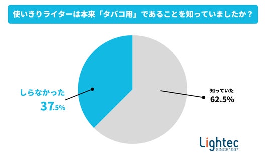 そこで、使いきりライターが、本来「タバコの点火用」として認識されていることを知っていたか尋ねたところ、約3人に1人(37.5%)が「知らなかった」と回答。多くの人が、使いきりライターの本来の用途や、キャンドル点火時のリスクについて十分に認識していない可能性が読み取れます。