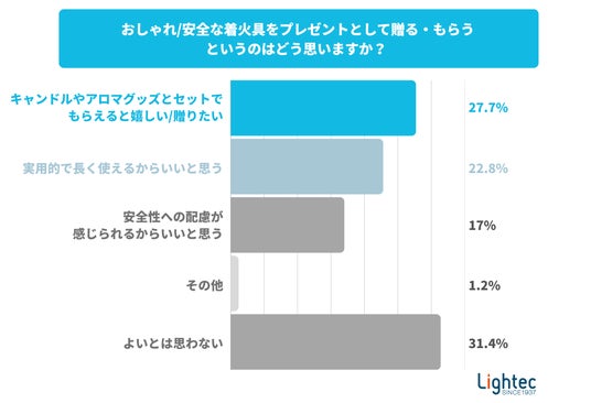最後に、おしゃれな着火具をプレゼントとして贈る・もらう、というのはどう思うか尋ねました。ここでは「キャンドルやアロマグッズとセットでもらえると嬉しい/贈りたい(27.7%)」という回答があり、着火具がギフトとして魅力的な商品になりうる可能性も示されました。