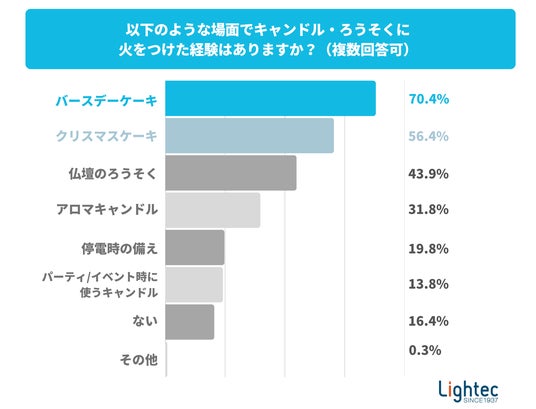 最初に、どのような場面でキャンドル・ろうそくに火をつけた経験があるか尋ねました。すると、「バースデーケーキ(70.4%)」や「クリスマスケーキ(56.4%)」といったイベントでの利用が上位を占め、ホリデーシーズンに火を灯す機会が非常に多いことが読み取れました。