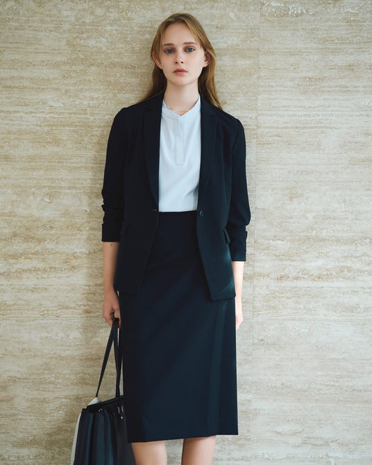本商品は、「きちんと見えて、ラクに動ける"おしゃれ見えスーツ"」をコンセプトに開発しました。しなやかに伸びる2WAYストレッチ素材を採用し、ビジネスシーンに求められる品格と美しさはそのままに、一日中快適に過ごせる着心地を実現。ジャケットはパネル切り替えやダーツをあえて省くことで自然な抜け感を演出し、細身のナローラインがすっきりとした美しいシルエットを生み出します。パンツはウエストゴムで着用しやすく、前ギャザーがないため上品な印象を維持。スカートはストレートシルエットに巻き風タックを加えることで、女性らしい上品な雰囲気を醸し出します。ジャケットとボトムスを自由に組み合わせることで、様々なシーンやスタイルに対応できる多様性も魅力です。