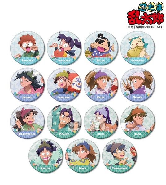 猪名寺乱太郎、摂津のきり丸、福富しんべヱ、ヘムヘム、久々知兵助、尾浜勘右衛門、不破雷蔵、鉢屋三郎、竹谷八左ヱ門、潮江文次郎、立花仙蔵、中在家長次、七松小平太、善法寺伊作、食満留三郎の描き下ろしイラストをグリッター加工を施した缶バッジに仕上げました。