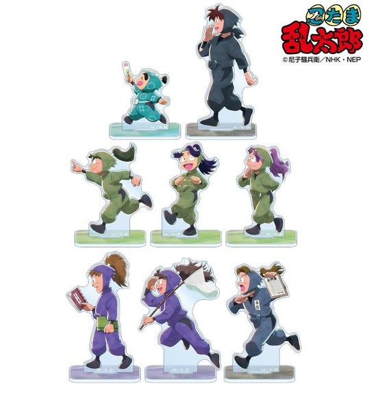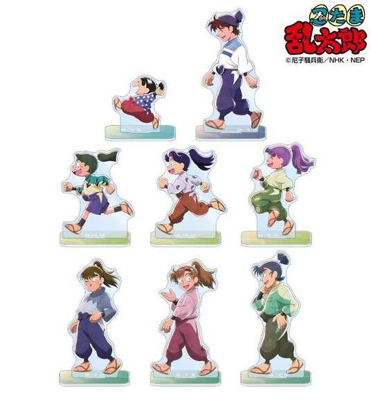 猪名寺乱太郎、摂津のきり丸、ヘムヘム、伊賀崎孫兵、次屋三之助、富松作兵衛、潮江文次郎、立花仙蔵、七松小平太の描き下ろしイラストをアクリルスタンドに仕上げました。
