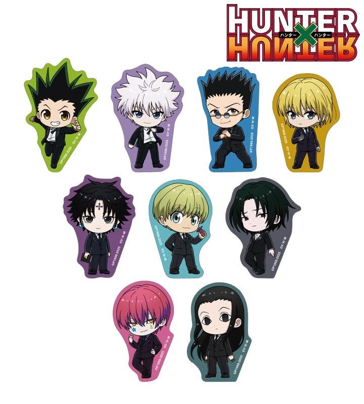 ゴン、キルア、レオリオ、クラピカ、クロロ、シャルナーク、フェイタン、ヒソカ、イルミの描き起こしちびキャライラストをメインにデザインし、ダイカットのステッカーに仕上げました。