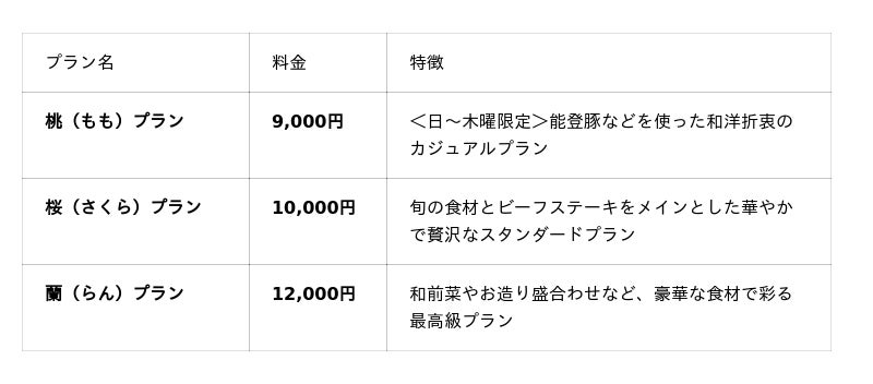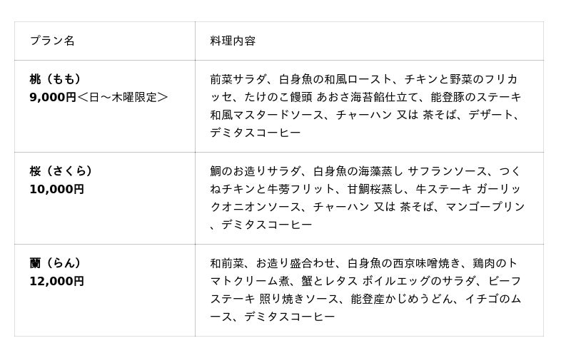 ホテル金沢のシェフが贈る、趣の異なる3つの特別コース。すべてのプランに2時間の飲み放題と宴会場使用料が含まれています。【対象期間】2026年3月1日(日)~4月30日(木)