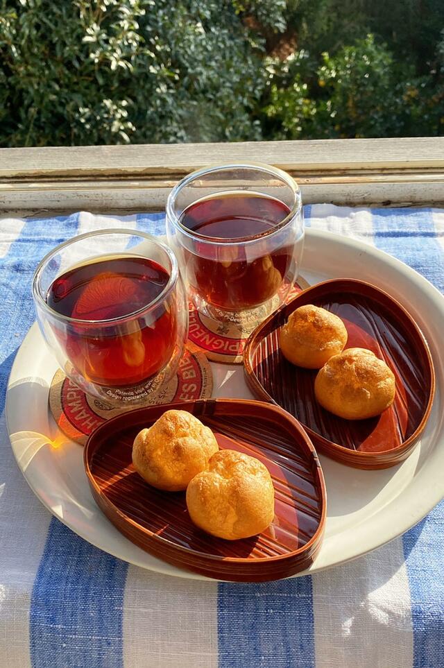 午後のおやつに紅茶とプチ・シュー。テラスの気温、なんと25℃! 暑い。これじゃ夏の気温ですよ。