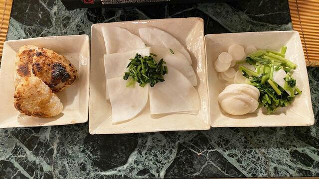 焼きおにぎり、千枚漬け、ぬか漬け。