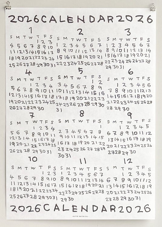 林青那によるポスター。2026年の暦が描かれているカレンダーのような一枚です。毎年、画材が変わることで、その表情が変化します。今年の画材はフェルトペン。