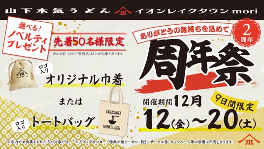 株式会社ガーデン(本社:東京都新宿区 代表取締役社長:川島賢 以下「当社」) が運営する、「山下本気うどんイオンレイクタウンmori」は、2025年12月20日(土)にオープン2周年を迎えます。ご愛顧くださるお客様への感謝の気持ちを込めて、「山下本気うどん イオンレイクタウンmori」にご来店いただいたお客様を対象とした「周年祭」を2025年12月12日(金)~20日(土)の9日間限定で開催いたします。