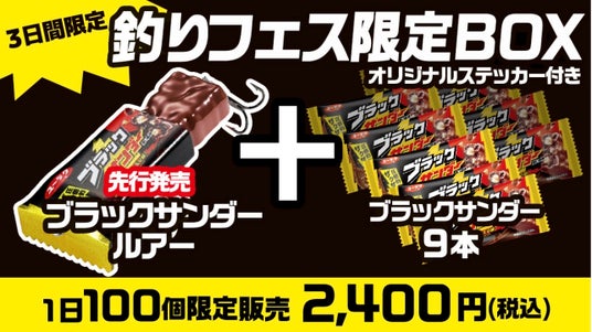 さらに、ブラックサンダールアーの先行販売として、釣りフェス限定BOXをご用意しました。ブラックサンダールアー1個とブラックサンダー9本、ブラックサンダールアーを使ってたくさんの魚を釣って欲しいという願いから制作した大漁旗風のオリジナルステッカーをセットにした特別仕様の「ブラックサンダールアー釣りフェス限定BOX」を、ルアーの定価と同価格の2,400円(税込)で数量限定販売いたします。