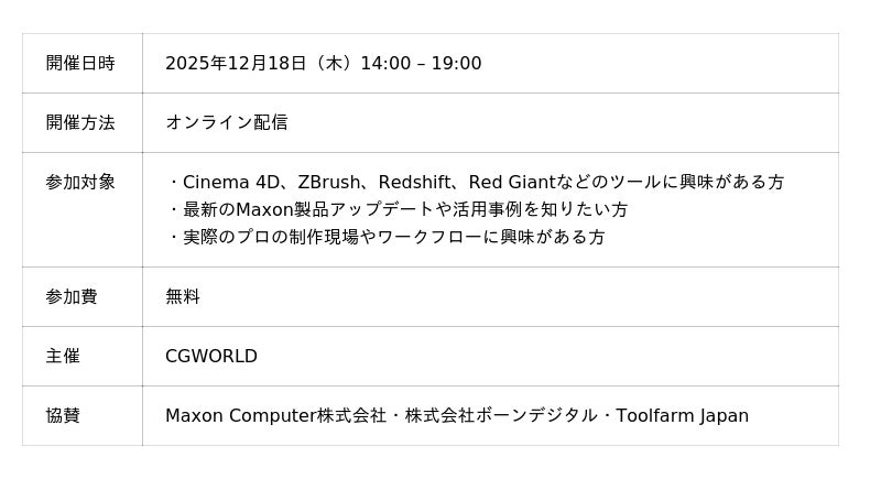 CG・映像制作の専門メディア「CGWORLD」を運営する株式会社ボーンデジタル(本社:東京都千代田区、CEO:新 和也、URL:https://www.borndigital.co.jp)は、クリエイティブツールを提供するMaxon Computer株式会社の協賛のもと、2025年12月18日(木)にオンラインイベント『MAXON PARTY '25 Xmas』を開催いたします。