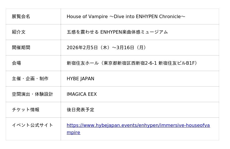 株式会社IMAGICA EEXは、株式会社HYBE JAPANが主催・企画・制作する、HYBE MUSIC GROUPアーティストとして初となる没入型楽曲体感ミュージアム『House of Vampire ~Dive into ENHYPEN Chronicle~』(2026年2月5日(木)から3月16日(月)まで東京・新宿住友ホールにて開催)の空間演出・体験設計を担当します。