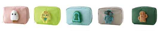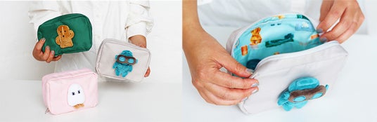 マスコットが本体に縫い付けられている、見た目も楽しいデザインのポーチです。裏地には、図鑑風デザインがプリントされています。