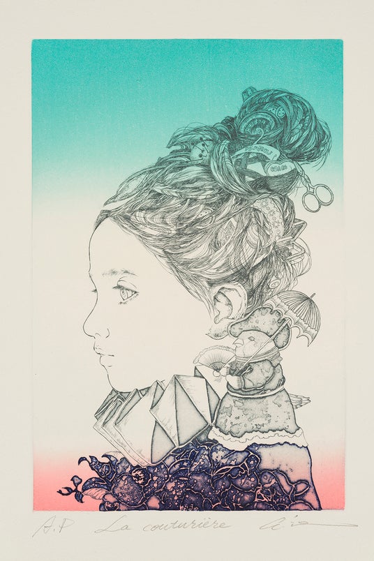 La couturiere(裁縫師)2021年 エングレーヴィング・エッチング、紙 30×20cm 作家蔵