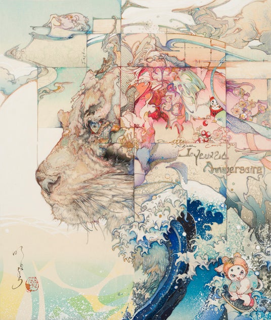 節句や暦、陰陽五行、歌舞伎など日本の伝統文化に着想を得た作品を通じて、“和”の精神と現代美の融合を探ります。2023年制作の《黒雲妖炎龍図》(龍を主題)と、新作《夢幻対峙之図》(虎を主題)を六曲一双の屏風として初公開し、その壮麗な入江氏の世界観を披露します。また、「東海道五十三次」シリーズをはじめとする、過去の名作へのオマージュ作品も展示。伝統と革新が交錯する入江作品の魅力を、存分にご堪能いただけます。