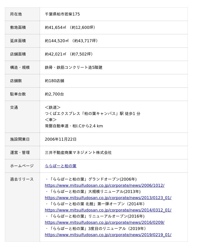 当該4施設は、三井不動産の商業施設事業の成長を加速させる存在として、2006年秋から2007年春にかけて開業し、「Growing Together」のコンセプトのもと、地域に根差し、お客さま・ご出店者さまをはじめとする事業パートナーの皆さま・街とともに成長を続けてまいりました。そして、このたび開業20周年という節目を迎えます。
