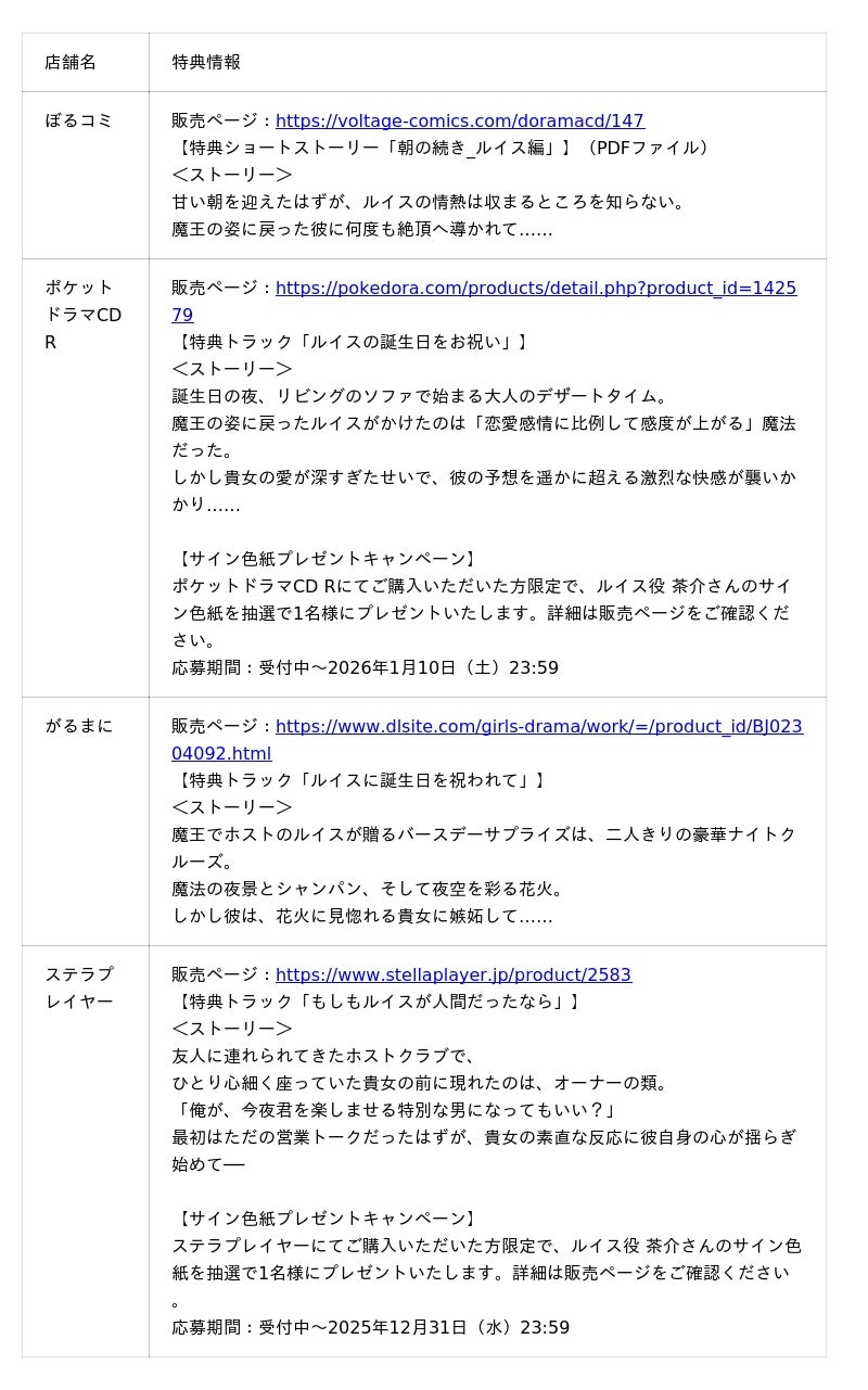 「ぼるコミ」にて「誘惑悪魔」シリーズをご購入いただくと、「誘惑悪魔」Vol1~3はジャケットイラスト(ロゴ無しver.)、Vol.4・5は特典トラック、OMNIBUS STORYは「一緒に過ごす朝」を描いたショートストーリーが手に入ります。