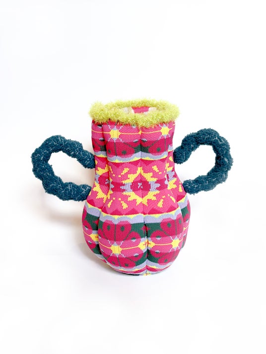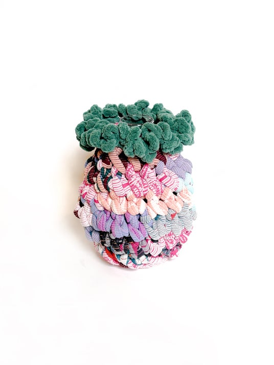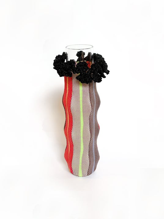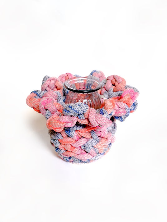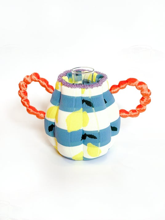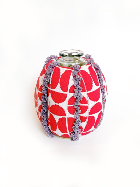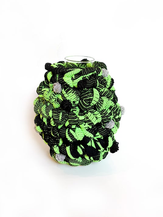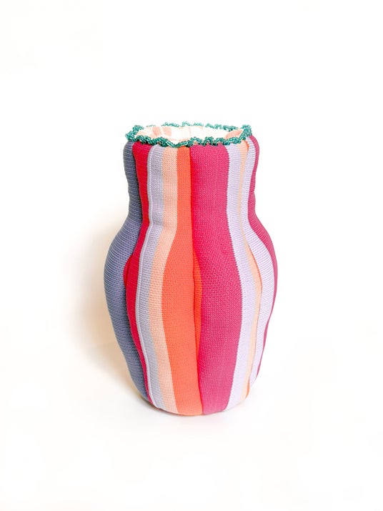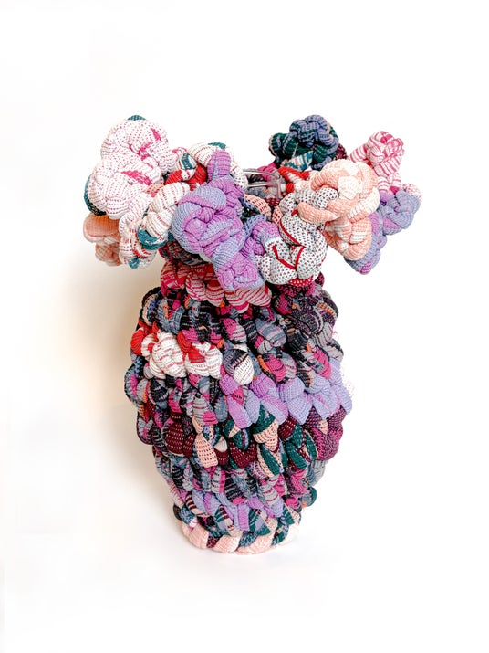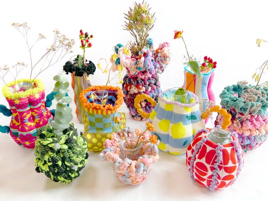 アースフレンドリーなライフスタイルブランド KNT365 と染めや刺繍、ニットなどのテキスタイル表現を用いた作品を制作するアーティスト「江上秋花」の “花器”でのコラボレーションが実現しました!KNT365では、傷などの理由からどうしても使えなくなってしまった編地を一切捨てることなく、大切に保管しています。