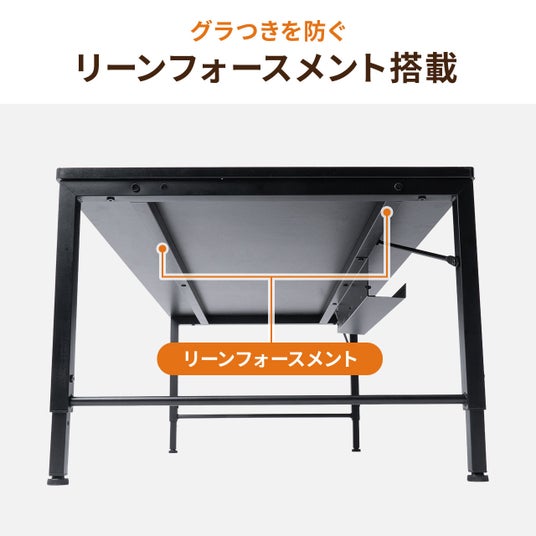 作業デスクを自分の使いやすいように、クランプ製品・モニターアーム取り付け対応。限られた天板スペースを有効活用でき、姿勢改善や配線整理にもつながります。趣味の制作や配信、ゲーミング環境づくりにもおすすめです。また、天板裏にリーンフォースメントが2本通っており、たわみなどを抑制し快適にデスクを使用できます。