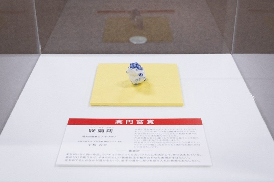 17回目となる今年は、グループ校(大阪芸術大学、大阪芸術大学短期大学部、大阪芸術大学附属大阪美術専門学校)の在学生総勢164名から177点にも上る個性豊かな作品の応募がありました。高円宮妃久子殿下、塚本 邦彦 大阪芸術大学理事長・学長・学院長、塚本 英邦 副理事長・副学長・短期大学部学長、山野 宏 工芸学科長(ガラス工芸)、壺井 勘也 美術学科教授(彫刻)、五十嵐 公一 美術学科教授(博物館副館長)、高木 喜峰氏(根付師)に審査をしていただき、高円宮賞や学長賞など17名の入賞者が選ばれました。