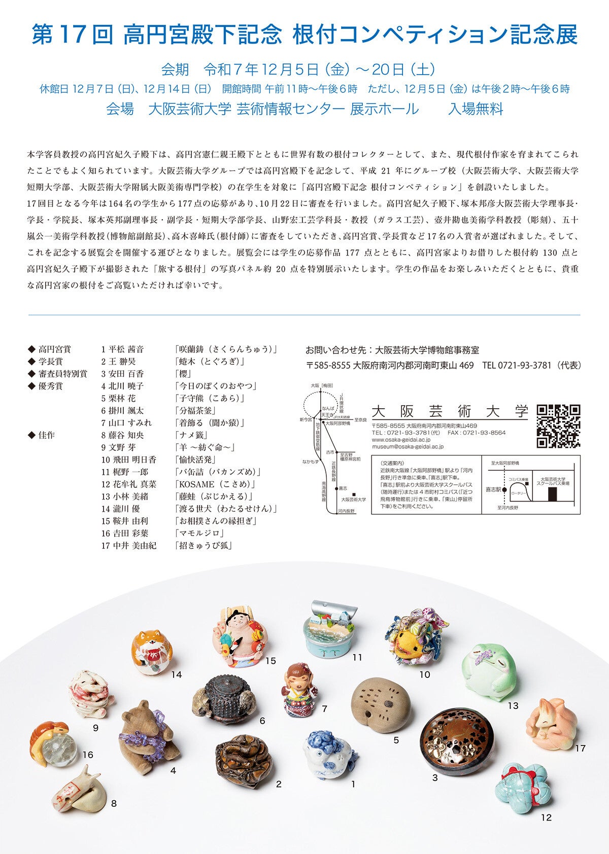大阪芸術大学グループ(学校法人塚本学院/所在地:大阪府南河内郡/学長:塚本 邦彦)は、2025年12月5日(金)~20日(土)の期間、大阪芸術大学 芸術情報センター1階 展示ホールにて「第17回高円宮殿下記念 根付コンペティション 記念展」を開催しております。