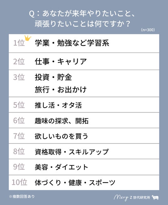 1位に「学業・勉強など学習系」、2位に「仕事・キャリア」、3位は同率で「投資・貯金」と「旅行・お出かけ」という結果になった。