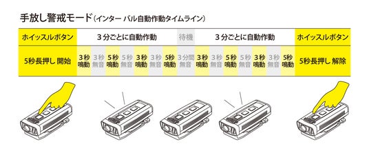電子ホイッスルボタンを押すと、110dBの大音量電子ホイッスルが鳴り響き、熊を寄せつけません。通常は押している間にホイッスルが鳴りますが、5秒間長押しで「手放し警戒モード」に切り替わり、自動で連続して電子ホイッスルを鳴らすこともできます。