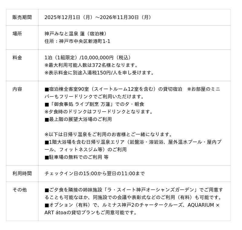 神戸みなと温泉 蓮(総支配人:横山 秀樹、所在地:神戸市中央区)は、12月17日に迎える開業10周年を記念して、お客様の日頃のご愛顧とご支援に感謝の気持ちを込め、オープンして初めてとなる「宿泊棟貸切チャータープラン」をはじめとした2つの開業10周年特別プランをご用意いたしました。