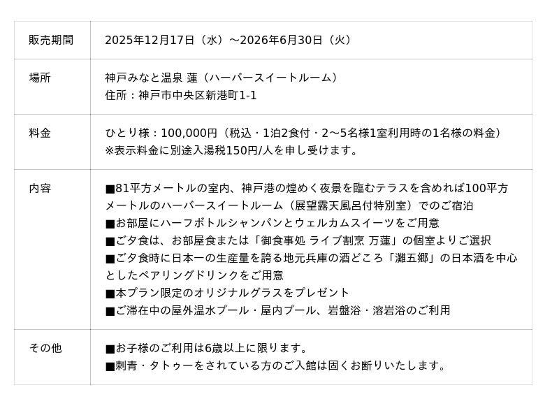 【お客様のお問い合わせ先】神戸みなと温泉 蓮 TEL:078-381-7000(代表)