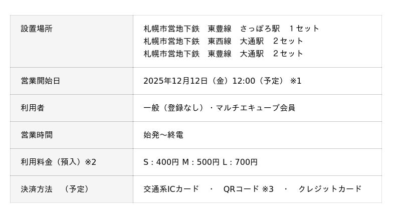 ○株式会社JR東日本スマートロジスティクス(東京都墨田区、代表取締役社長:市原 康史)は、予約・キャッシュレス・多言語対応可能な多機能ロッカー『マルチエキューブ』を札幌市営地下鉄のさっぽろ駅・大通駅に12月12日に設置いたします。