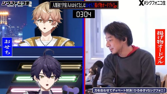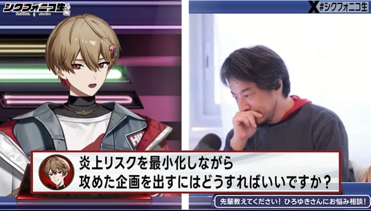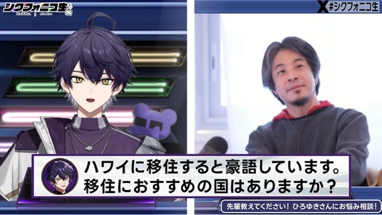 前半のコーナーは「先輩教えてください!ひろゆきさんにお悩み相談!!!」。シクフォニメンバー6人からそれぞれ、ひろゆきへ悩みを相談し、ひろゆきの広い知見からズバッと回答してもらいます。MCの鬼龍院がコーナーを進行しようとすると、ひろゆきから「鬼龍院さんMCやってるの新鮮な感じがしますね」と触れられると、鬼龍院は「音楽だけでは厳しいと最近気づき始めて…」と返し、視聴者からの笑いを誘いました。