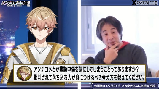 トップバッターは雨乃こさめ。「僕はとても頭がいいのですが、よくアホ扱いされます。賢そうに見える話し方のコツとかありますか?」という相談を投げかけ「メンバーにディベートで負けて虐げられているのが悔しい、勝ちたいんですよ!」と伝えると、ひろゆきからは「喋らない方がいいんじゃないですか?」とシンプルな回答が。「 賢く見せたいなら喋らない。喋るとアホが出ますからね。自分から喋るのではなく、誰かから振られた時にポイントだけ喋るようにしたらいいんじゃない?」(ひろゆき)というアドバイスに、視聴者からは「なるほど!」「的確なアドバイス」」とコメントが相次いでいました。
