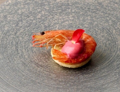 ロシア発祥のオードブル用パンケーキ「ブリニ」。ふんわり食感のブリニに、サクサクに揚げた小エビをのせ、キイチゴのマヨネーズソースで見た目もかわいらしく仕上げました。