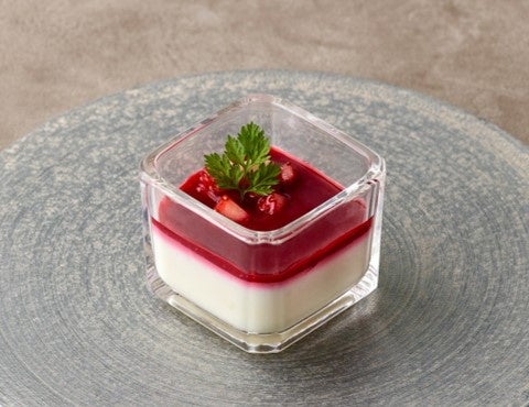 もちもちとした独特の食感が楽しい、グラス仕立てのパンナコッタです。濃厚な味わいに寄り添うのは、爽やかな酸味が広がるラズベリーソース。甘みと酸味、赤と白――それぞれのコントラストが際立つ、見た目にも華やかな一品です。