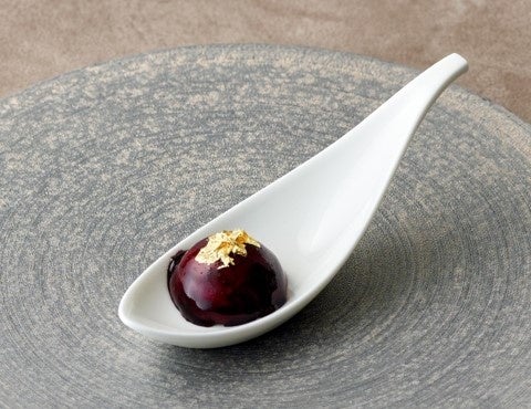 低温でじっくり火入れした伊勢どりに、生クリームとハーブを合わせてなめらかな一口ムースに仕上げました。ポルト酒のジュレでコーティングし、金箔をそっとあしらった、見た目も味わいも大人の一品です。