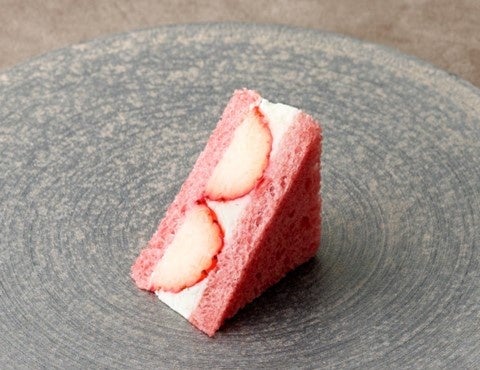 ラズベリーとビーツが練り込まれた、香り豊かな国産小麦パンで作ったフルーツサンド。真っ赤な外皮と白い果肉のコントラストが特徴の三重県産いちご「かおり野」ならではの、断面の美しさも楽しめるサンドウィッチです。