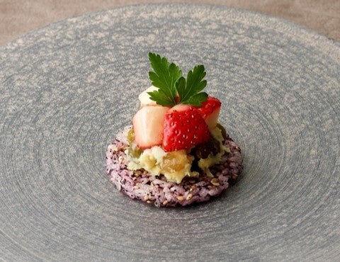 新食感の一皿!ゆかりと白ごまを混ぜ込んだ三重のブランド米「結びの神」を香ばしくカリッと焼き上げた和風ガレットに、甘納豆とクリームチーズのマッシュ、角切りいちごを重ねました。和と洋の楽しみがギュッと凝縮されたオードブルです。