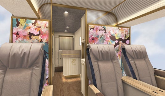 内装も含めた全体のデザインは、多様な商空間のプロデュースに強みを持つ(株)スペースとともに、既成のバスの概念を超えるような車両を作り上げました。通常の大型観光バス(正席49名/シート間隔795mm)に比べてゆったりとくつろげるように天龍工業(株)製の一人掛シートを採用し、(株)ミネルバ製の上質なコンソールを設置することで快適性を高め、一席あたりのスペースにゆとりを持たせた計18席のみ(シート間隔1,050mm)の定員としています。また、車内には名古屋市出身の画家 岩崎知子氏製作の季節に応じた絵画を掲出します。