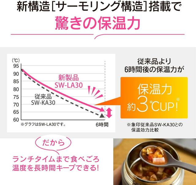 ステンレス真空二重構造に加え、保温・保冷性能をさらに向上させるための象印の独自技術「サーモリング構造」を取り入れることで、温度キープ力がアップ。あたたかいメニューを6時間後でも71℃以上に保てます。