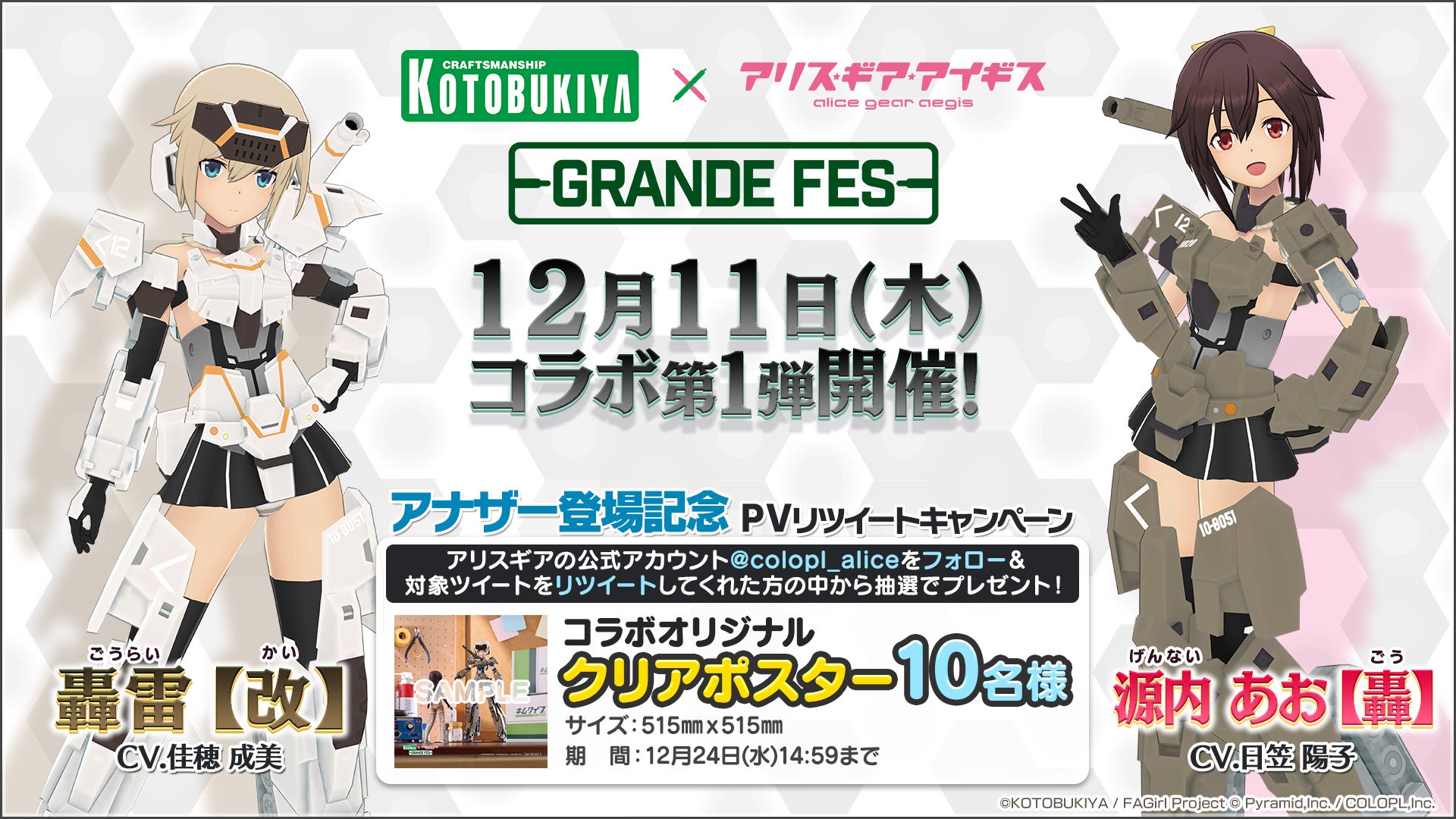 株式会社コロプラ(代表取締役社長 上席執行役員 CEO:宮本貴志、本社:東京都港区、以下「コロプラ」)は、スマートフォン向けゲーム『アリス・ギア・アイギス(以下、アリスギア)』にて、2025年12月11日(木)より『コトブキヤ × アリス・ギア・アイギス グランデフェス』を開催します。グランデフェスでは『コトブキヤ(株式会社壽屋)』タイトルとのゲームコラボイベントの開催や『コトブキヤショップ(株式会社壽屋)』とのコラボを開催します。