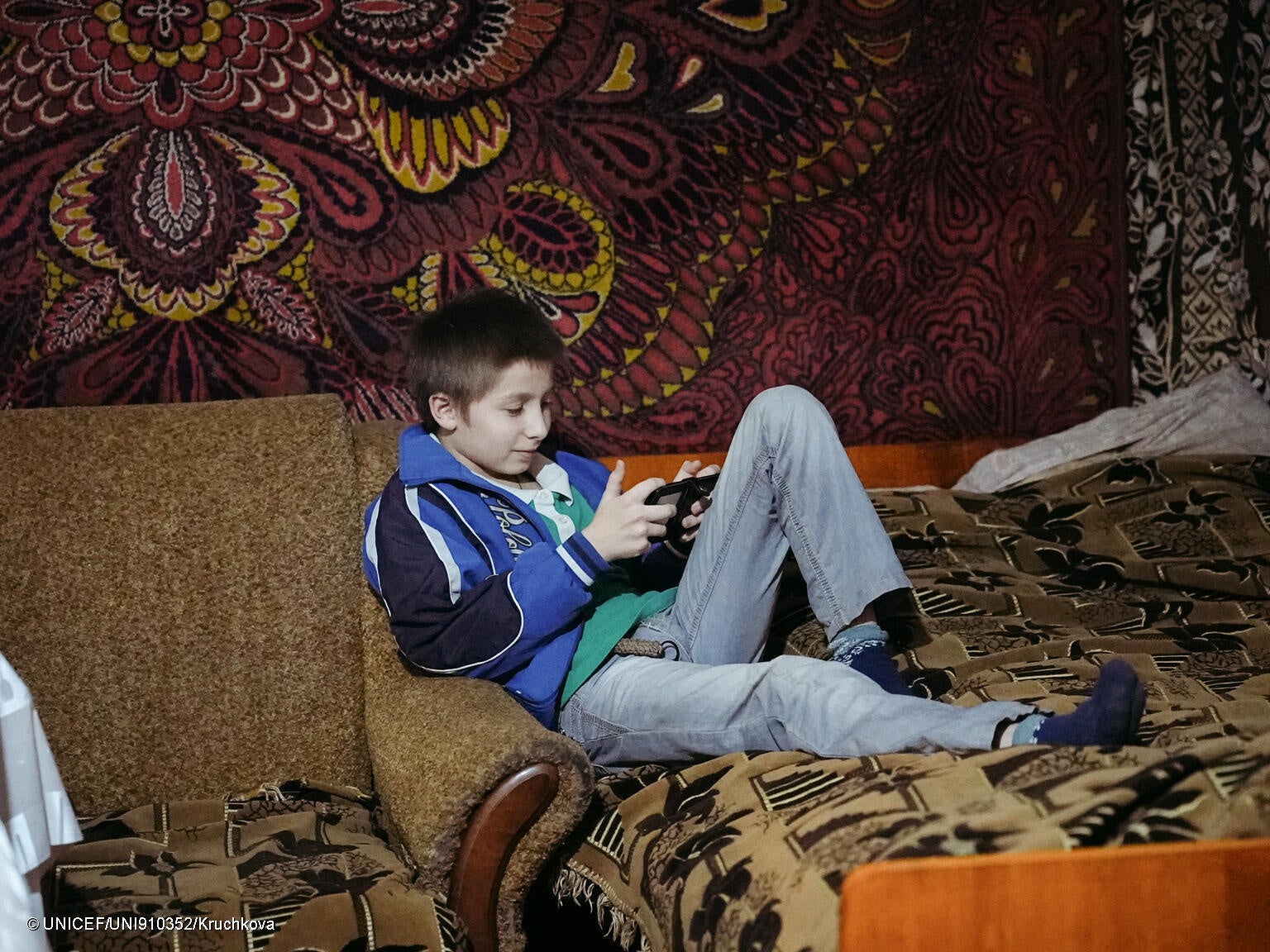 自宅のリビングで、スマートフォンを使って遊ぶ男の子。戦争下で停電が続くなかでも、こうした何気ない日常を保つことが子どもにとってとても重要である(ウクライナ、2025年11月6日撮影) (C) UNICEF/UNI910352/Kruchkova