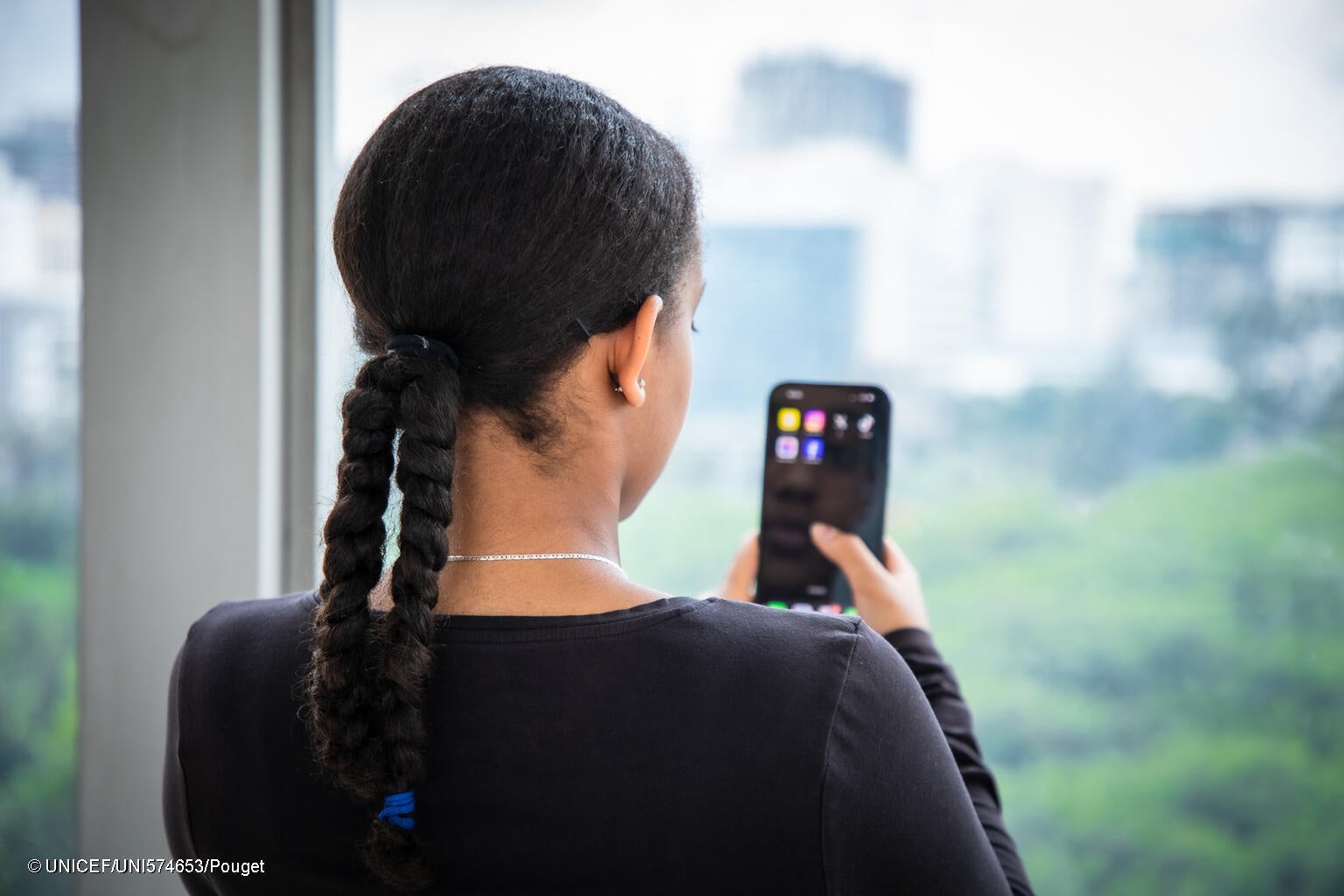 スマートフォンを操作する女の子。オンラインの世界は、無限の可能性がある一方で、いじめなどに巻き込まれるリスク等もある(エチオピア、2024年5月10日撮影) (C) UNICEF/UNI574653/Pouget