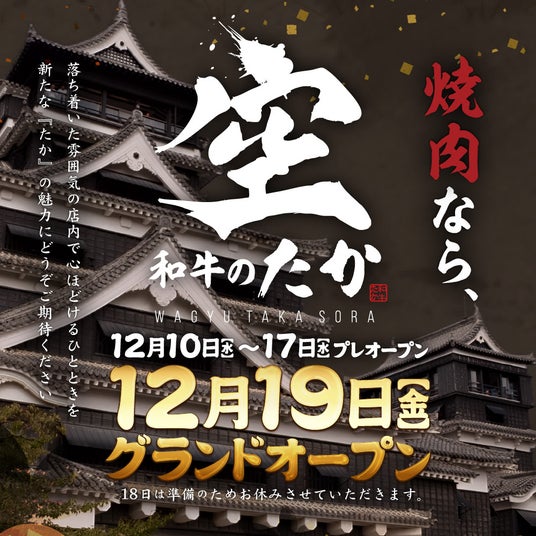 株式会社Kj(本社岡山県倉敷市)が運営する「和牛のたか」の熊本2号店がグランドオープン!! 厳選和牛を、落ち着いた空間で、心ほどけるひとときを、新たな「たか」の魅力に、どうぞご期待ください。