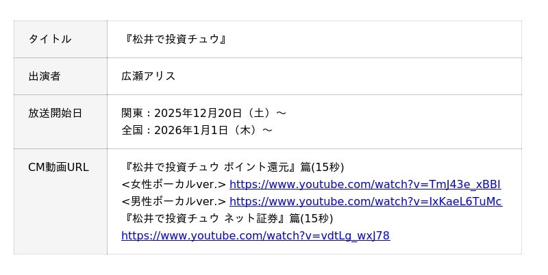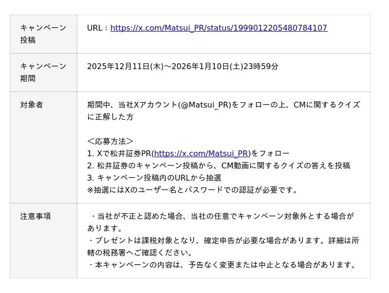 松井証券株式会社(本社:東京都千代田区、代表取締役 社長執行役員:和里田 聰、以下「当社」)は、新CMの放映を記念して、2025年12月11日(木)より「新CM放映記念キャンペーン」を開催いたします。本キャンペーンでは、当社Xアカウント(@Matsui_PR)をフォローし、CM動画に関するクイズに正解した方に、抽選で5名様に3万円分、1,000名様に300円分の「えらべるPay(R)」*1をプレゼントいたします。