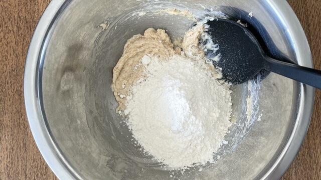 砂糖を加えてすり混ぜ、牛乳を加えて混ぜます。クッキー粉を加えて粉っぽさがなくなるまで混ぜていく!