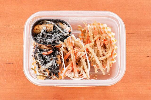 個人的につくりおきで重宝しているのが、ひじきの煮物やきんぴらごぼう。多めにつくって、お弁当カップに小分けにして冷凍しています。
