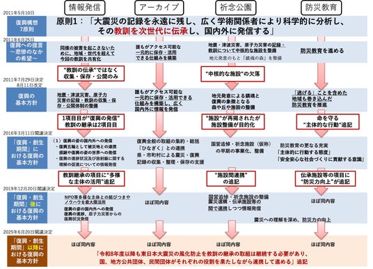 2011年5月の復興構想7原則で掲げられた「教訓を次世代に伝承」が、本年までに復興庁でどのように位置づけられ、予算化されてきたかを整理しています。
